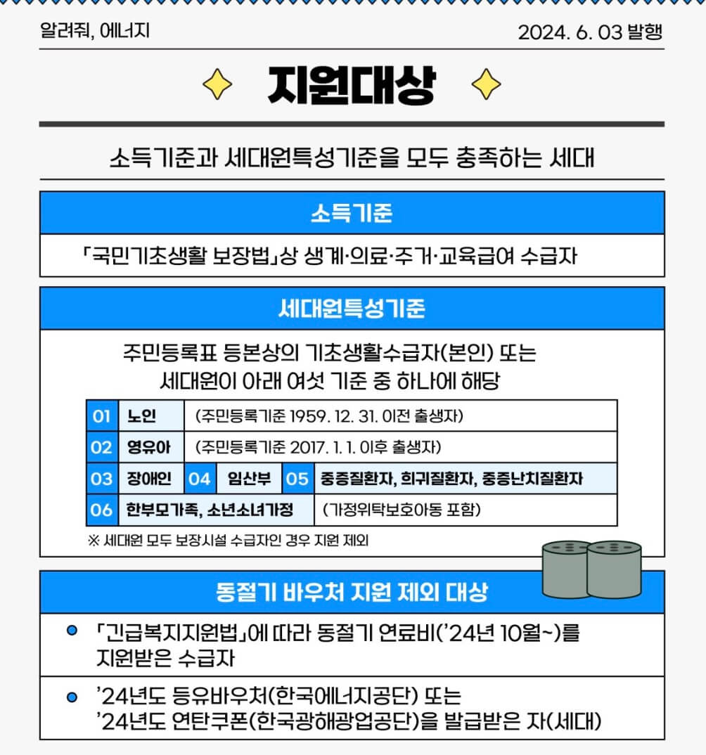 ● 24년도 등유바우처(한국에너지공단) 또는 24년도 연탄쿠폰(한국광해광업공단)을 발급받은 자(세대)